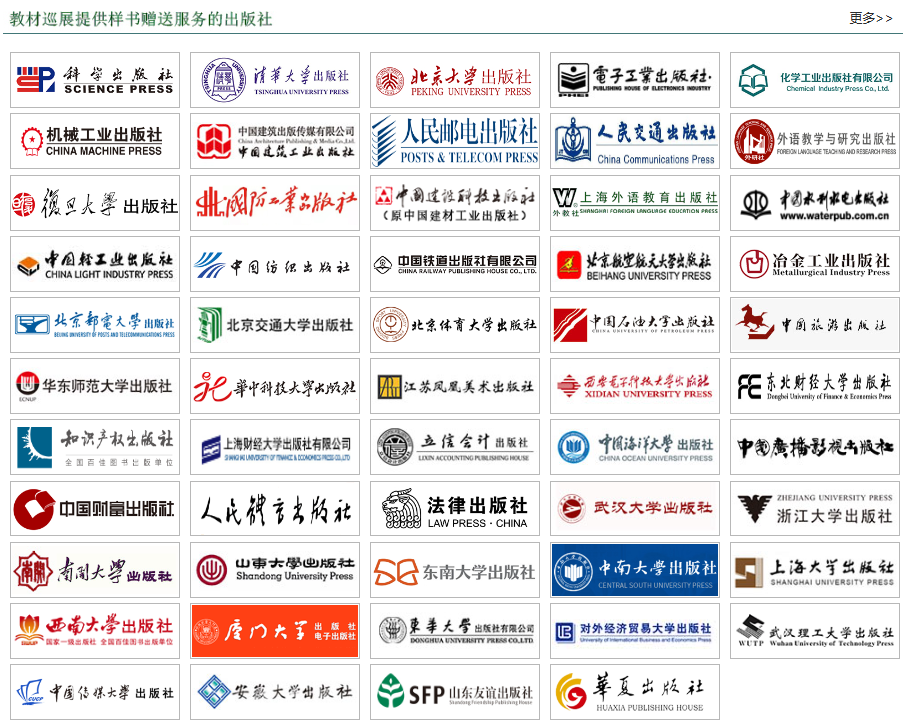 以上為參與教材樣書贈(zèng)送的54家出版社圖標(biāo) 參與教材樣書申請(qǐng)學(xué)校共:598所 教材樣書申請(qǐng)次數(shù):5997次