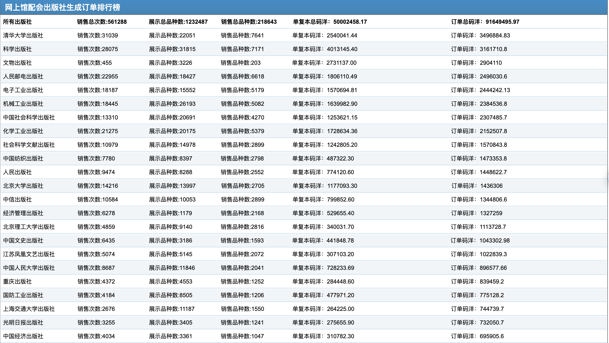 1. 出版社單復本銷售碼洋百強榜 【特別提示】 1.本榜單是將產品按單副本進行統(tǒng)計 2.本榜單不包含圖書館采編人員使用采訪數(shù)據(jù)、現(xiàn)貨目錄批量下載功能和采集器掃碼選采功能形成的訂單碼洋 3.網(wǎng)上館配會平臺展示圖書品種數(shù)均為出版社可供品種,并實時更新。