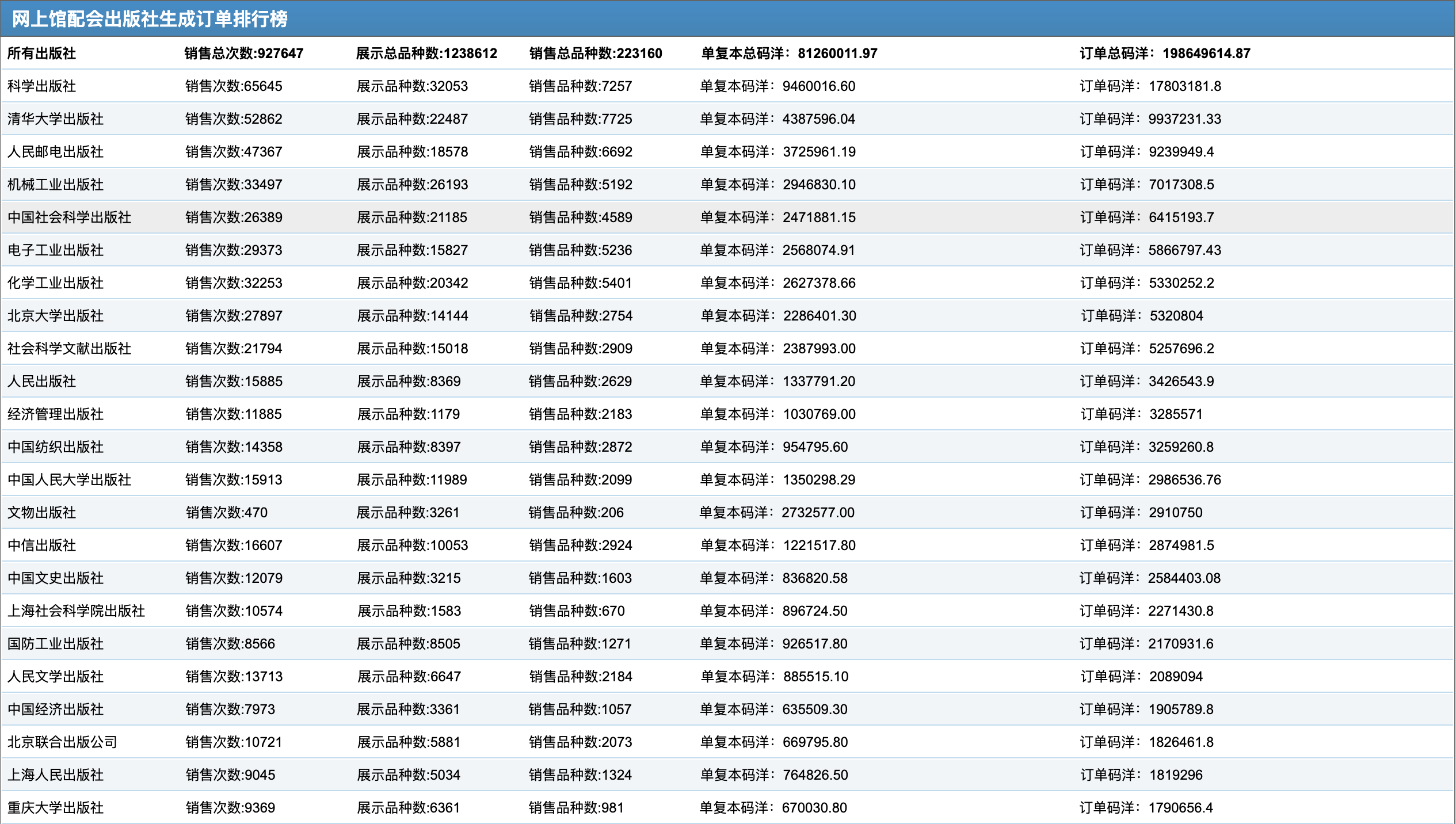 1. 出版社單復(fù)本銷售碼洋百強(qiáng)榜 【特別提示】 1.本榜單是將產(chǎn)品按單副本進(jìn)行統(tǒng)計 2.本榜單不包含圖書館采編人員使用采訪數(shù)據(jù)、現(xiàn)貨目錄批量下載功能和采集器掃碼選采功能形成的訂單碼洋 3.網(wǎng)上館配會平臺展示圖書品種數(shù)均為出版社可供品種,并實時更新。